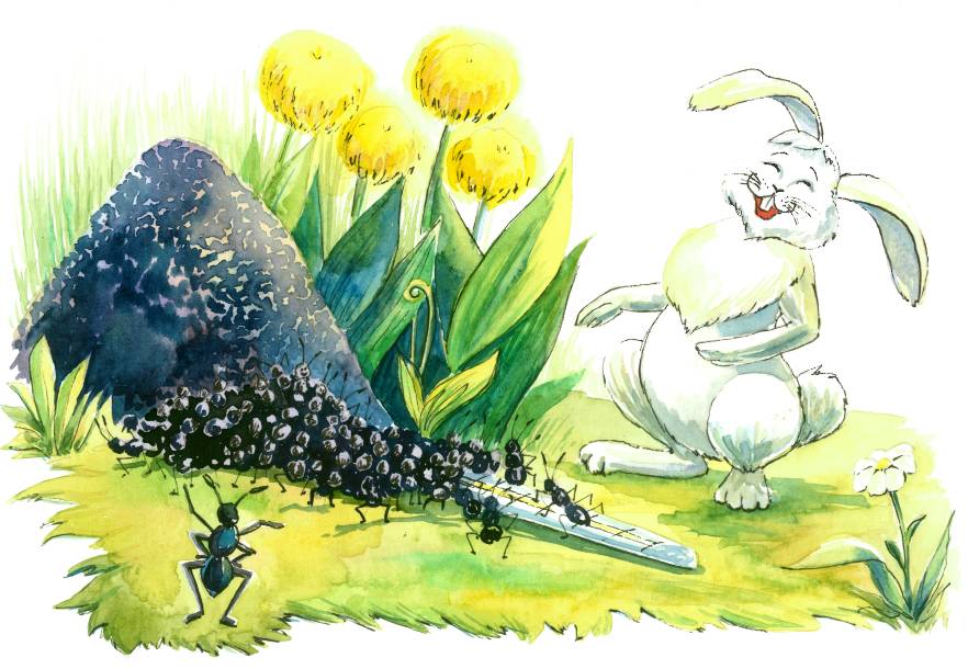 Заяц как начал хохотать, аж на землю упал, задними лапами по земле стучит, передними за живот держится. Муравьи испугались Зайца и попрятались в своих домиках. Наконец Заяц успокоился, поднял градусник и увидел, что тот показывает температуру больше той, которая раньше была на градуснике. Задумался Заяц: