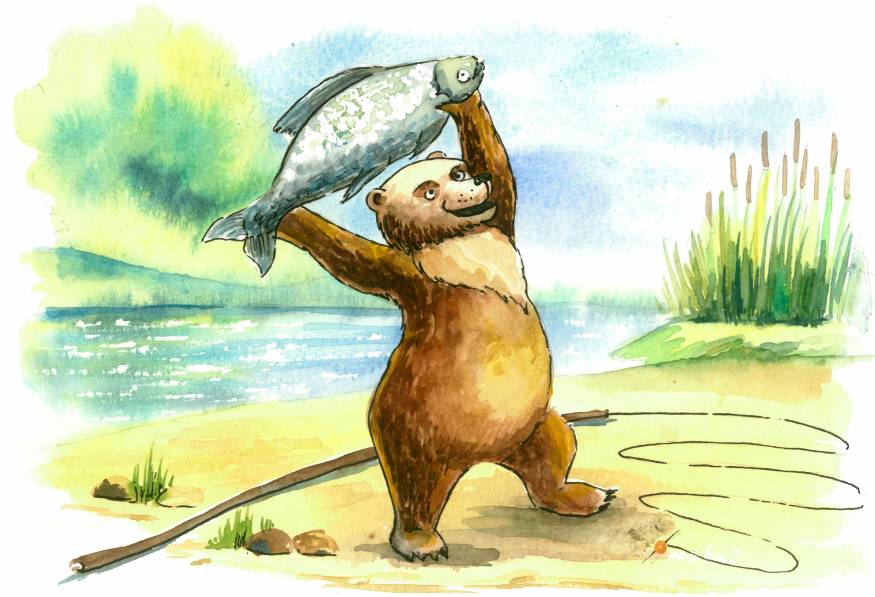 На другой день Медведь неподалёку от пруда нашёл длинную палку. Раза в два, а то и в три длинней, чем сам Медведь. Прицепил к ней леску, крючок с поплавком и уселся на берегу. Закинул удочку и стал ждать. Ждал Медведь долго, уж было засыпать начал, как вдруг поплавок задёргался и нырнул под воду. Медведь испугался и как дёрнет, а рыбина крупная попалась, не отпускает и всё пытается Медведя в пруд утащить. Но Медведь тоже сдаваться не собирается, тянет за удочку, ветка гнётся, того гляди сломается.