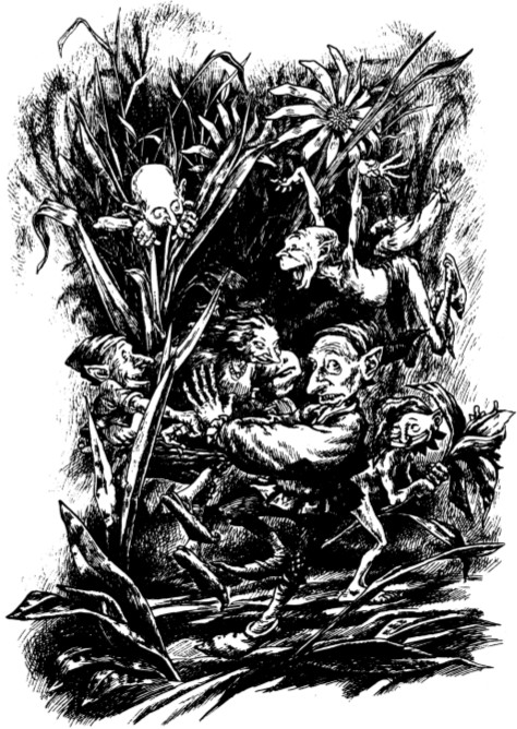 And away every one of the fairies scampered off as hard as they could, concealing themselves under the green leaves of the foxglove; where, if their little red caps should happen to peep out, they would only look like its crimson bells; and more hid themselves at the shady side of stones and brambles, and others under the bank of the river, and in holes and crannies of one kind or another.