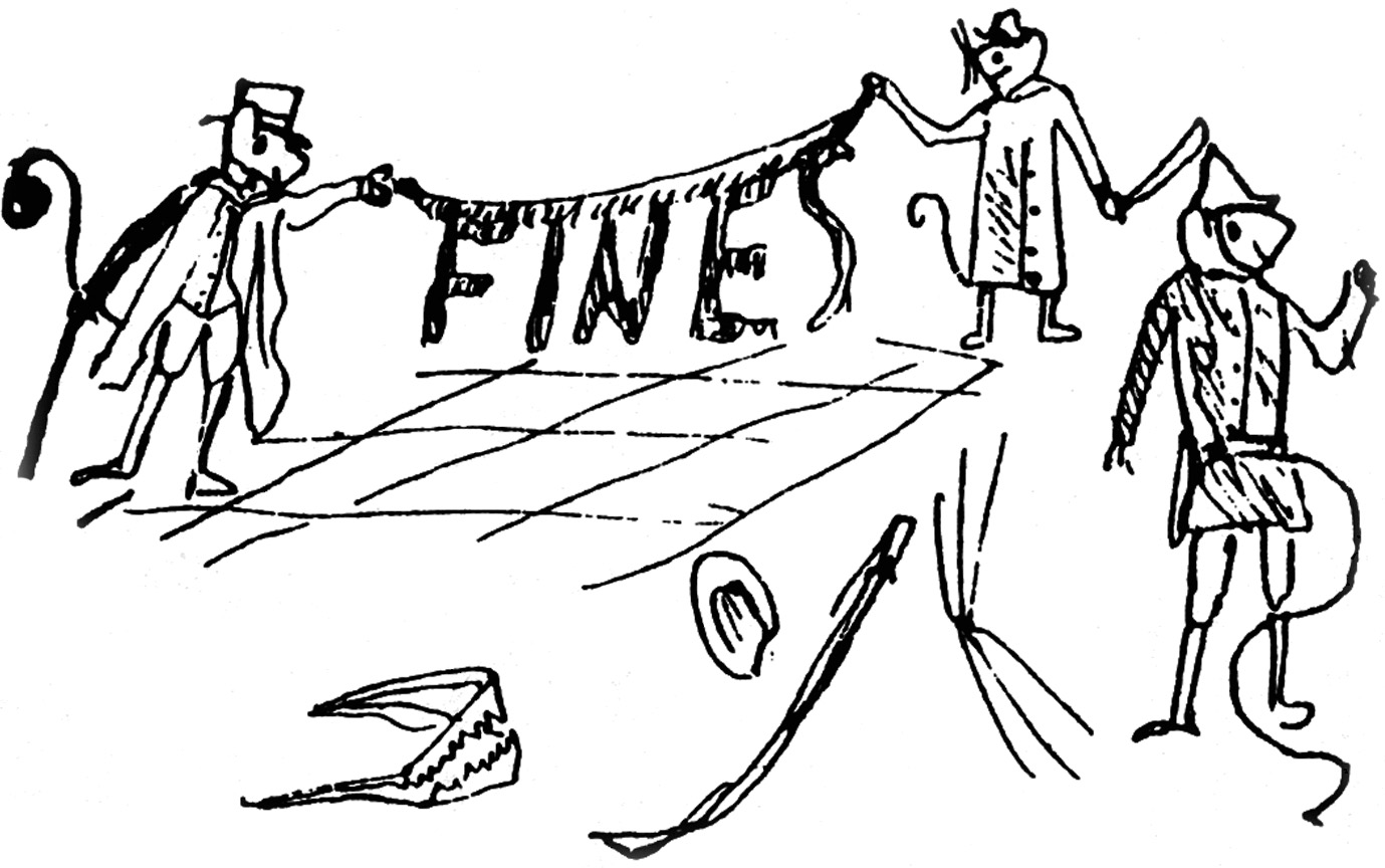 After watching for some time he saw a mouse coming twards the house. As soon as Mr No-Tail came near he got caught in the trap. ‘Come and help me!’ cried No-Tail as soon as he saw Peter at the window. Peter Mouse came out and let him go, then he asked No-Tail to stay the night with him. He took No-Tail in and gave him some beer then Peter led him up-stairs and gave him a bed, and as he slept went down to the polease office. Then he got No-Tail ‘run in’.
