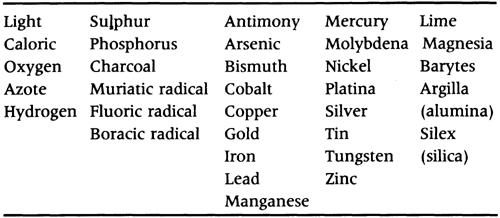 TABLE 3.2 Lavoisier’s ‘elements’ or ‘simple substances’.