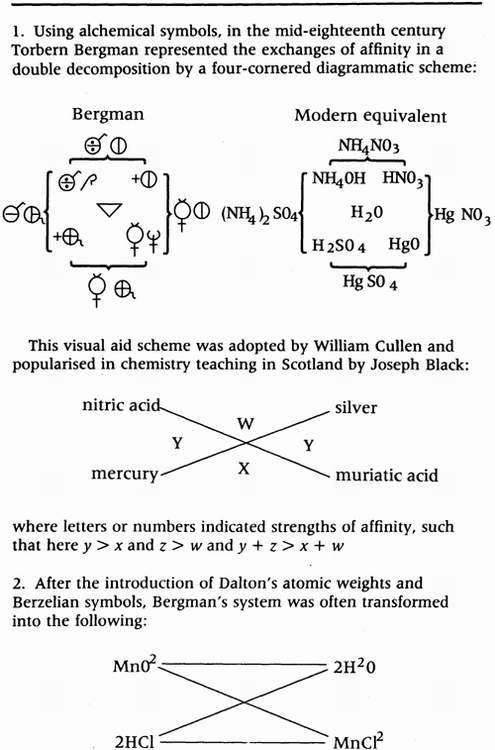 As we have seen, Dalton angrily rejected Berzelius’ symbols mainly on the grounds that they did not indicate structure but were merely synoptic. Nor was he at all pleased with the way Berzelius had taken over his creation and transformed it electrochemically. On his part, Berzelius, after struggling for years to obtain a copy of Dalton’s New System, expressed deep disappointment with the book when he eventually read it in 18127: