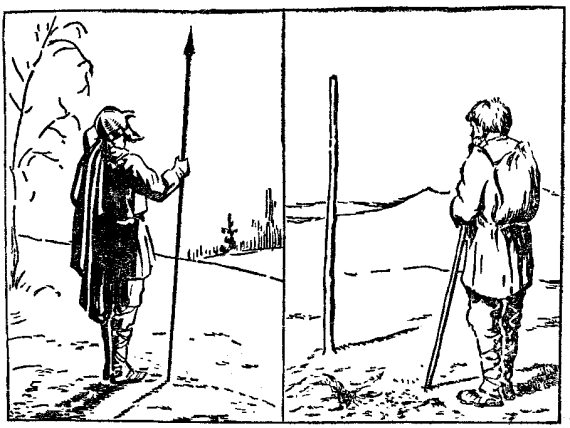 Рис. 1. Определение времени дня по положению Солнца на небе (слева) и по длине тени (справа)