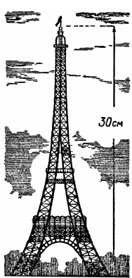 Железная Эйфелева башня высотою 300 м (1000 футов) весит 9000 т. Сколько должна весить точная железная модель этой башни высотою 30 см (один фут)? (Рис. 1.)