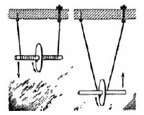 С точки зрения механики, йо-йо не что иное, как видоизменение общеизвестного маятника Максвелла (рис. 5): небольшой маховичок падает, разматывая навитые на его ось нити, и приобретает постепенно столь значительную энергию вращения, что, развернув нити до конца, продолжает вращаться, вновь наматывая их и, следовательно, поднимаясь вверх. При подъеме, вследствие превращения кинетической энергии в потенциальную, маховик замедляет вращение, наконец останавливается и опять начинает падение с вращением. Опускание и подъем маховичка повторяются много раз, пока первоначальный запас энергии не рассеется в виде теплоты, возникающей при трении.