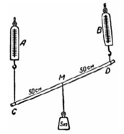 Который из двух изображенных здесь (рис. 9) пружинных безменов, поддерживающих стержень CD в наклонном положении, показывает бо́льшую нагрузку?