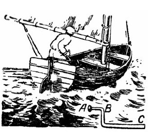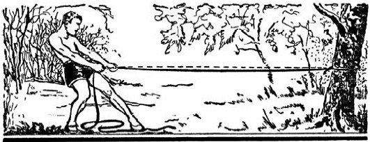 Чтобы вытащить увязший в выбоине автомобиль, прибегают к следующему приему. Привязывают его длинной прочной веревкой крепко к дереву или к пню близ дороги так, чтобы веревка была натянута возможно туже. Затем тянут за веревку под прямым углом к ее направлению. Благодаря этому усилию, автомобиль сдвигается с места.