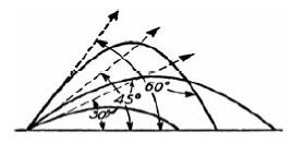 Три снаряда пущены из одной точки с одинаковыми скоростями под различными углами к горизонту: в 30°, 45° и 60°. Пути их (в несопротивляющейся среде) показаны на рис. 14.
