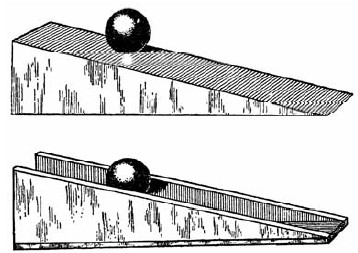 2. Из двух одинаковых шаров один катится по наклонной плоскости, другой С по краям двух параллельных треугольных досок (рис. 19). Угол наклона, а также высота, с какой началось движение, в обоих случаях одинаковы.