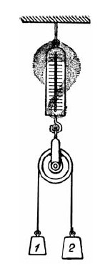 Через блок перекинута веревка с грузами на концах в 1 кг и 2 кг. Блок подвешен к безмену (рис. 22). Какую нагрузку показывает безмен?