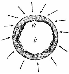 Рис. 27. К какой точке должны падать земные тела: к центру С земного шара или к общему центру масс (М) Земли и Луны?