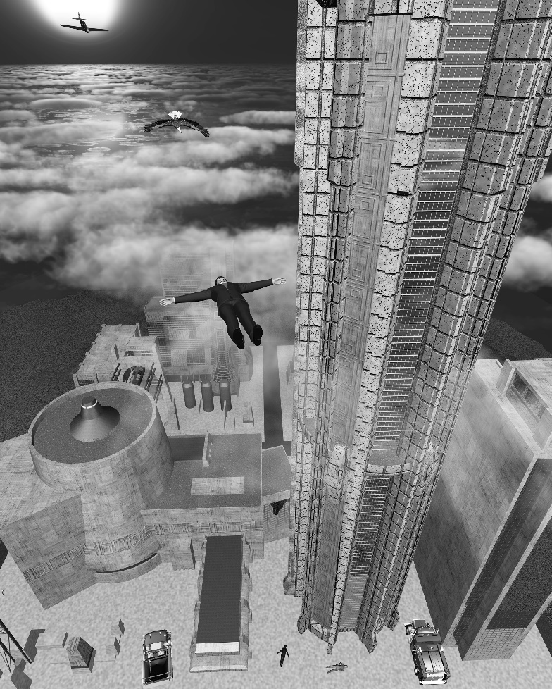 Казалось невероятным, что человек может парить в воздухе, но стоило зрителю глянуть вниз на раскинутые тела и брошенные людьми пожарные машины, как все становилось понятно. Композицию завершал самолет, полный несчастных пассажиров, беспощадно пикирующий на небоскреб.