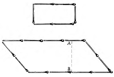 8. Решение этой задачи показано на рис. 13. Площадь верхней фигуры образуют два квадрата, каждый со сторонами в одну спичку. Нижний четырехугольник представляет собой параллелограмм, высота которого AB = 11/2 спички. Площадь параллелограмма по правилам геометрии равна его основанию, умноженному на высоту: 4 х 11/2 = 6, т. е. втрое больше площади верхнего четырехугольника.