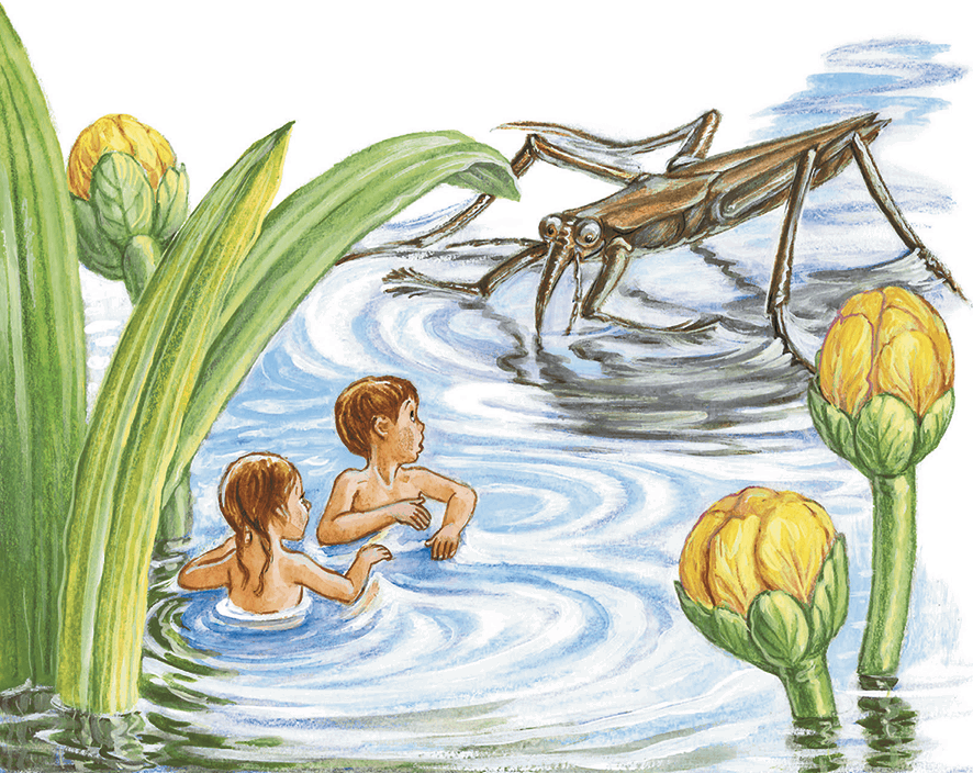 Водомерка-великан приближалась с невероятной быстротой. Бурое тело, покрытое снизу беловатыми волосками, слегка покачивалось на ходу. Большие шарообразные глаза пристально смотрели на ребят.