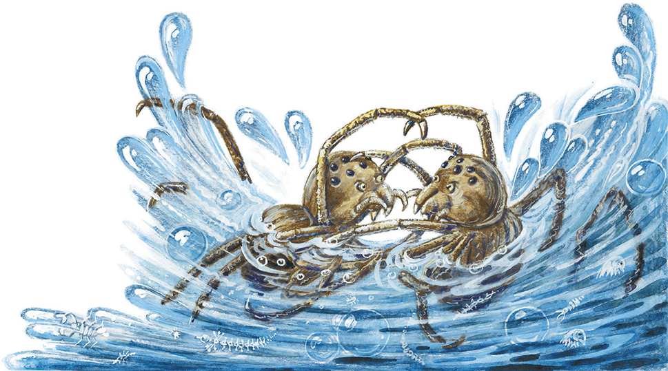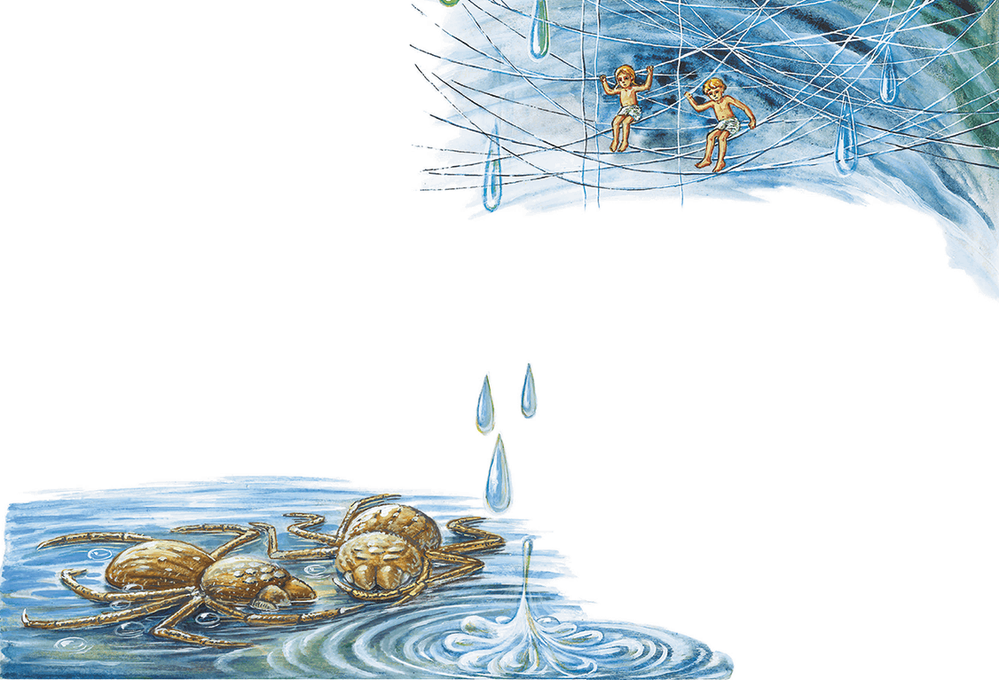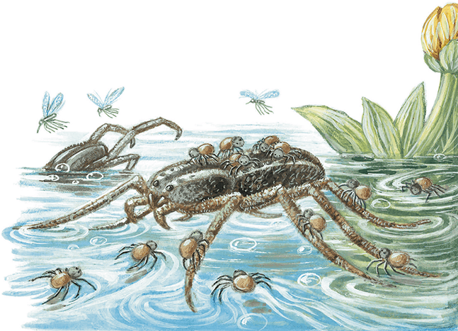 Но малыши вряд ли могли сражаться. Они суетливо забегали по воде, налетали один на другого, кувыркались, а потом все кинулись к пауку-победителю и, толкаясь, проворно взобрались к нему на спину.