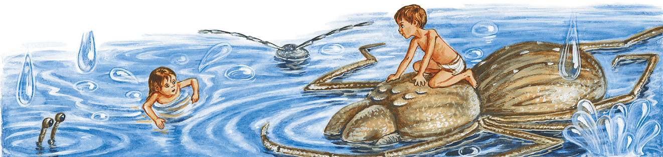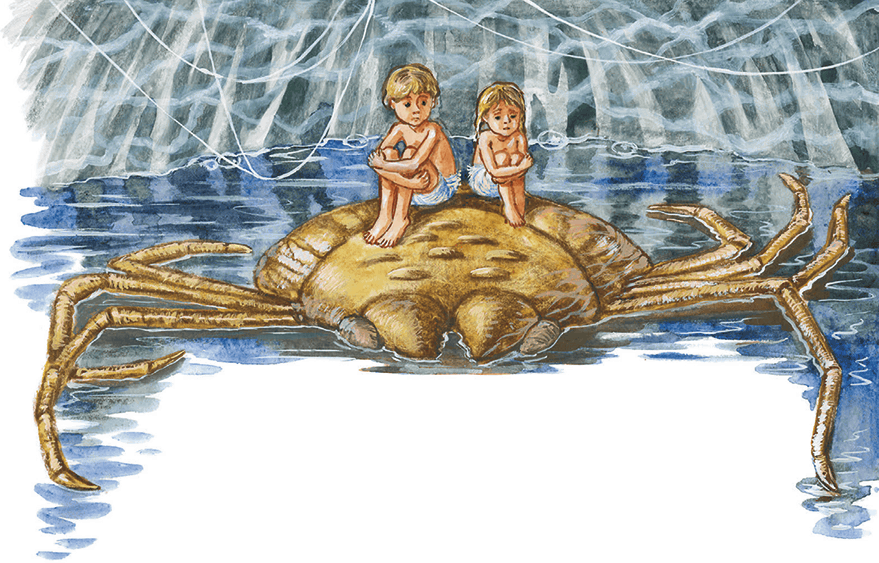 В широком протоке между островами ребята увидели коричневое волосатое чудовище на длинных изогнутых ногах. Оно сновало взад и вперед, скользя по воде круглым, толстым брюхом.