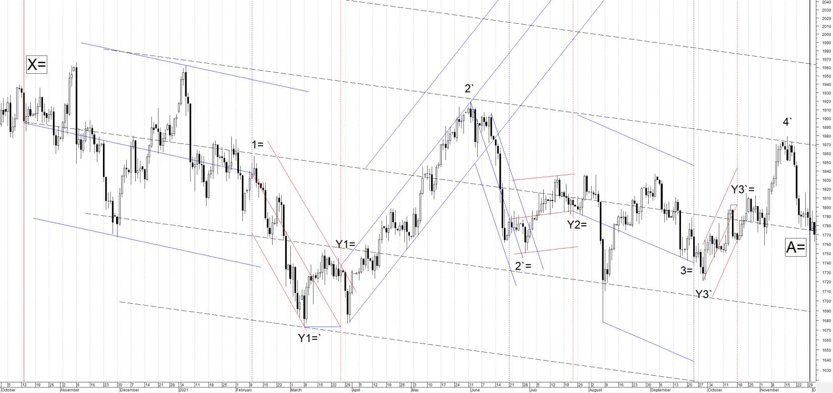 Представляю вам график Золота (XAU/USD) с 13 октября 2020г. по 30 ноября 2021г. В это время цена торговалась в канале волны А=. Далее рассмотрим её составные волны подробнее (1, Y1, 2, Y2, 3, Y3, 4).