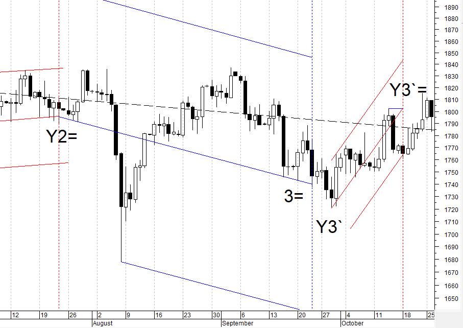 Волна Y3 является импульсной коррекционной волной. Волна 3 закончилась достаточно низко, и волна Y3 достигла цели своего падения всего через четыре дня после своего начала. Далее она сформировала коррекционный канал с целью в его центре в точке Y3`=. Достигнув цели этого канала преждевременно, цена закрылась в момент завершения волны на противоположной движению грани канала.