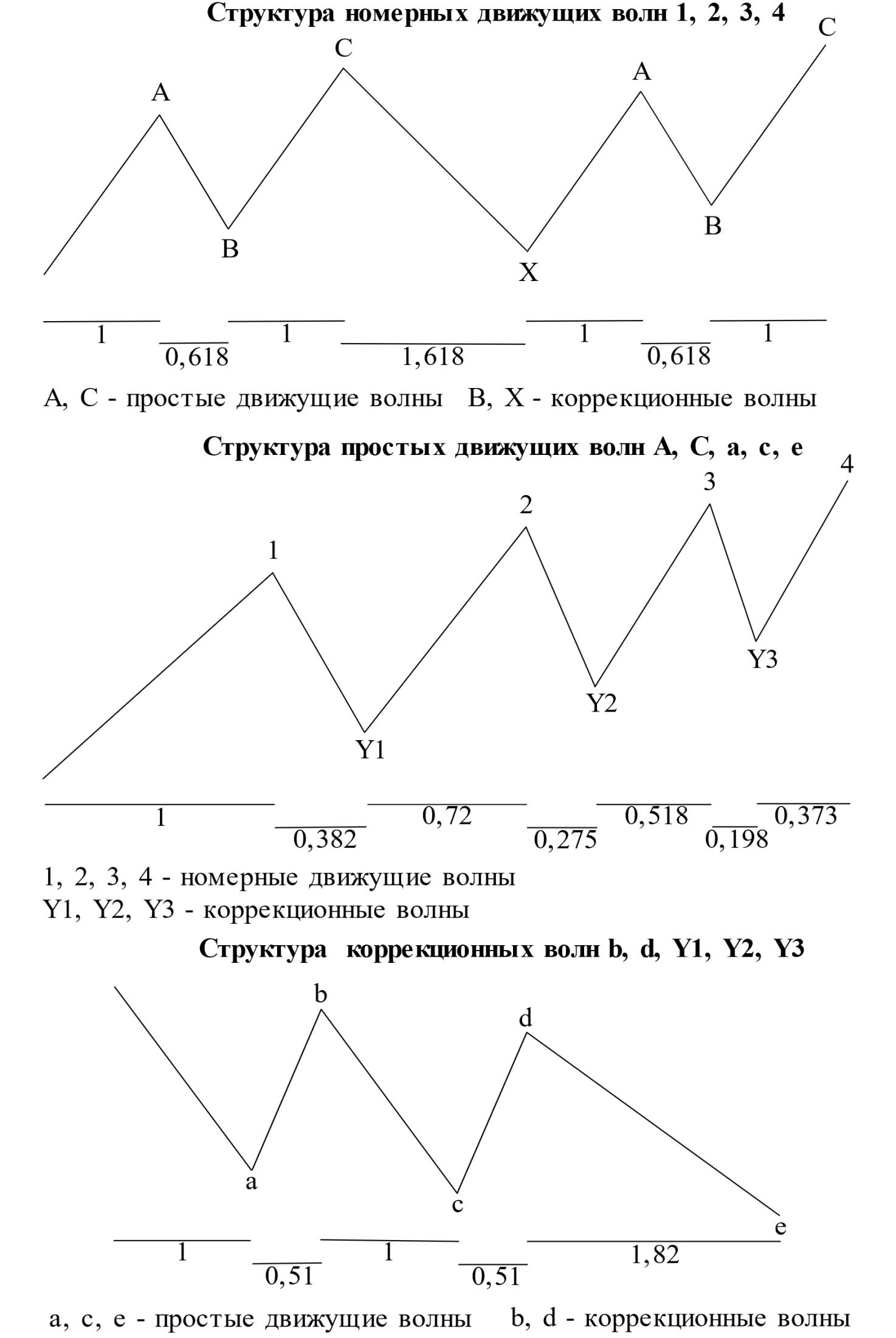 Волны A, C являются простыми движущими, B, X – коррекционными. Простые движущие и коррекционные волны имеют разную структуру.