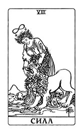 Одна из кардинальных христианских добродетелей, символизирующая силу, которая дается для преодоления испытаний, трудностей, ограничений. На карте изображена женщина, укрощающая льва, – это мягкая сила подавляет животные инстинкты, поднимается на уровень осознанности и развития.
