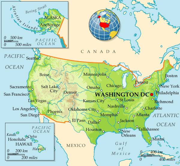 Сегодня США состоит из 48 граничащих друг с другом штатов в «континентальной части» и 2-х штатов, не имеющих общей границы с остальными: Аляски – огромного полуострова, занимающего северо-западную часть континента Северная Америка, и островов Гаваи в Тихом океане. Кроме того, в состав США входят некоторые территории в Карибском море (Пуэрто-Рико, Американские Виргинские острова и др.), Тихом океане (Восточное Самоа, Гуам и др.) и не являющийся штатом Федеральный округ Колумбия.