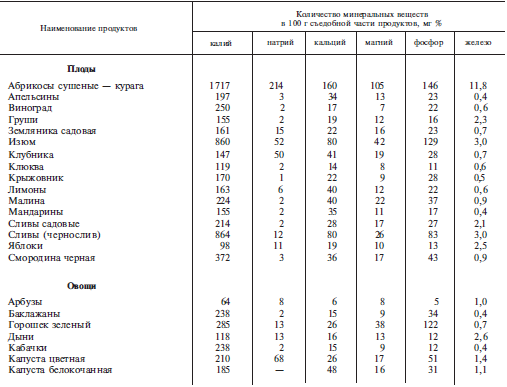 Наиболее богаты минеральными веществами плоды и овощи, но основным источником солей кальция и фосфора являются продукты животного происхождения, главным образом молоко и молочные продукты, особенно творог и сыры. Соли кальция в значительном количестве содержатся в фасоли, зеленом луке, петрушке, шпинате, салате, капусте, но кальций растительных продуктов усваивается организмом значительно хуже, так как часто связан со щавелевой кислотой, которая образует с ним нерастворимые соединения. Много фосфора содержится в сыре, твороге, мозгах, говяжьей печени, треске, сельди, крупах (гречневой, овсяной, пшенной), бобовых, богат им также ржаной хлеб из обойной муки и желток куриного яйца. Солями калия наиболее богаты овощи и плоды, особенно сушеные абрикосы (урюк, курага), изюм, чернослив, финики, инжир. Много его в картофеле, шпинате, редьке, фасоли.