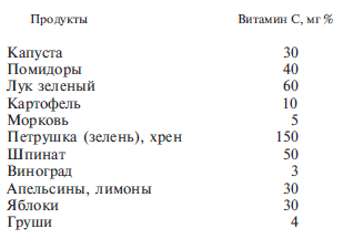 В и т а м и н С (аскорбиновая кислота) играет в организме важную биологическую роль. Он активно участвует в окислительно-восстановительных процессах, влияет на белковый и углеводный обмен, повышает сопротивляемость организма к различным инфекциям и т. д. Недостаток витамина С приводит к быстрой утомляемости, сонливости, апатии. При длительном недостатке, а тем более при отсутствии аскорбиновой кислоты в пище расстройство организма усиливается и может возникнуть тяжелое заболевание – цинга. В сутки взрослый человек должен получать от 50 до 100 мг аскорбиновой кислоты. Особенно богаты витамином С плоды шиповника, зеленые грецкие орехи, черная смородина, красный перец, хрен, укроп и др. Данные приводятся рядом.