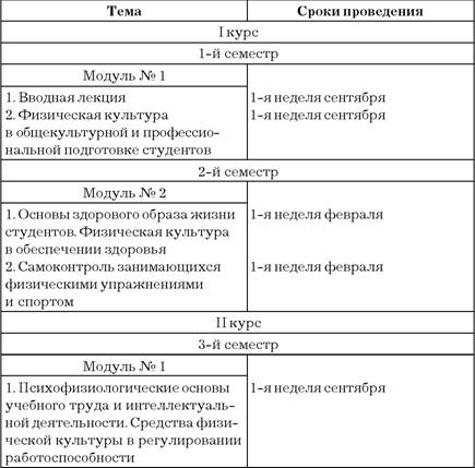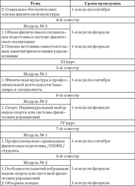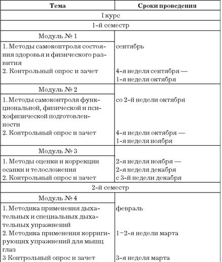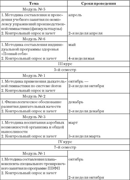 Каждый раздел содержит определенное количество модулей обучения и моделей подготовленности, которые зависят от задач и курса обучения. Например, теоретический раздел I–II курсов содержит по два модуля и четыре темы, III–IV курсов – по одному модулю и одной теме. Методико-прак-тический подраздел I–II курсов – по шесть модулей и шесть тем, III–IV курсов – по три модуля и три темы. Учебно-тренировочный подраздел включает в себя также шесть модулей на I–II курсах и три модуля – на III–IV курсах. Теоретический раздел представляет собой цикл лекций. Методико-прак-тический подраздел – проведение методико-практических занятий по разработанному нами методическому пособию, а также ведение дневника самоконтроля студента, в который заносятся результаты показателей физического развития, построенные графически, и результаты контрольных тестов по видам подготовленности, построенных с учетом динамики развития их поэтапно и по годам обучения. Учебно-тренировочный подраздел построен аналогично предыдущим по системе модулей, но его модули состоят из модулей физического развития и моделей по различным видам подготовленности. В содержание данного подраздела входит разработанная нами программа по углубленной физической подготовке студентов. Контроль предполагает сдачу зачетов по темам обучения, контрольных нормативов и тестирование, а также занятия в форме семинаров, диспутов-дискуссий, межэтапную и поэтапную корректировку уровней подготовленности студентов.