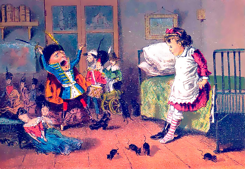 – Ах, милая мама, сказала Маша, разве ты не видишь, что все это были следы большего сражения между куклами и мышами. Я ведь оттого так и испугалась, что мыши хотели взять в плен бедного Щелкуна, который командовал армией кукол. Я бросила в мышей мой башмак и не знаю, что потом случилось.