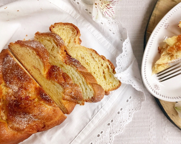 Что делать дальше? Вариантов множество, и обо всех из них мне рассказала мадам де Ламбаль. Однако сегодня я пробую самый простой из них, а именно: вооружившись острым ножом, разрезаю свой прямоугольник по длинной стороне на три одинаковые полоски, сделав небольшой отступ от верхнего края, чтобы полосы были как бы скреплены. После этого из трёх полос начинаю заплетать обычную косу, последовательно закладывая друг на друга то правую, то левую «пряди». Защипываю концы верхнего и нижнего краёв рулета и слегка загибаю их вниз, чтобы сформировать аккуратное изделие. Выкладываю его с помощью широкой лопатки на смазанный маслом противень. В идеале взять глубокую прямоугольную форму длины вашего пирога: тогда её стенки будут ограничивать тесто по бокам и провоцировать его подъем исключительно вверх. У меня нужного размера не оказалось, поэтому использовала обычный жаростойки поддон.