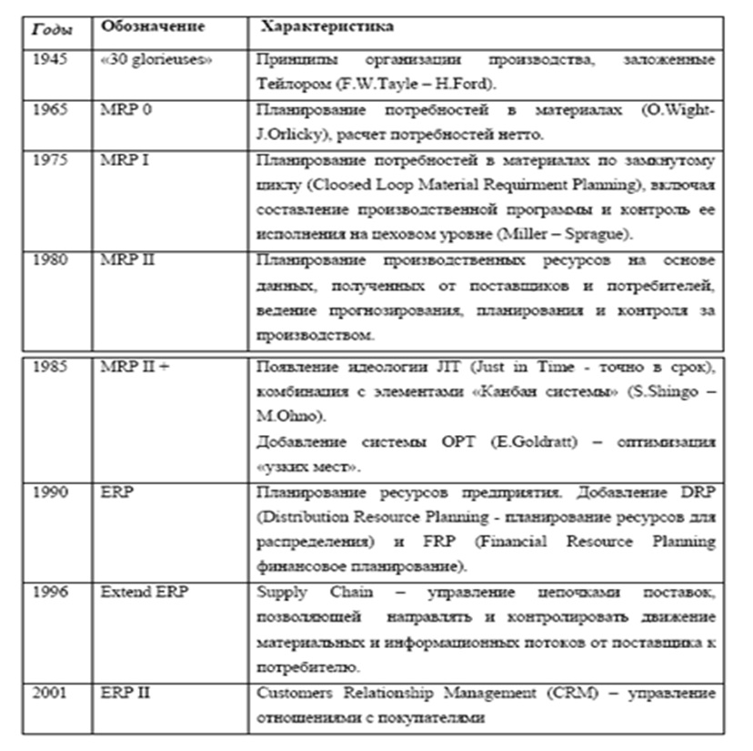 Исторически, методология Enterprise Requirement Planning (ERP), то есть планирование ресурсов предприятия, является результатом последовательного развития, начавшегося с концепции Material Resource Planning (MRP), обеспечивавшей планирование потребностей предприятий в материалах. Преимущества, даваемые MRP, состоят в минимизации издержек, связанных со складскими запасами сырья, комплектующих, полуфабрикатов и прочего, а также с аналогичными запасами, находящимися на различных участках непосредственно в производстве.