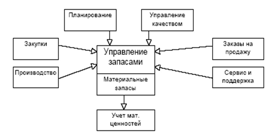 При решении задач управления запасами – производится обработка и корректировка всей информации о приходе, движении и расходе сырья и материалов, промежуточной продукции и готовых изделий; учет запасов по складским ячейкам, выбор индивидуальных стратегий контроля, пополнения и списания запасов по каждой позиции номенклатуры сырья и материалов, и т.д. Учитывается нормативная и текущая фактическая стоимость запасов, а также отслеживается прохождение отдельных партий запасов и серий изготавливаемой продукции.