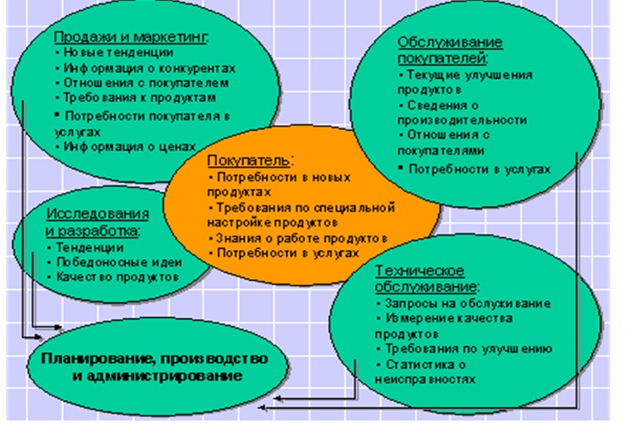 Ответ в том, что производители решительно принимают решения по выбору продуктов и рынка; но эти решения, и лица их принимающие изолированы от исполнительных подразделений организаций. Критическая информация о покупателе и знание рынка удалены из основной системы планирования бизнеса и изолированы в различных местах, разбросанных по организации. Не существует конкретного и действенного способа проводить знания о покупателе через организацию. Как показано на рисунке 1.1.10 покупательская информация существует в подразделениях из четырех основных функциональных областей: Продажа и Маркетинг, Обслуживание покупателей, Техническое обслуживание, Исследование и разработка.