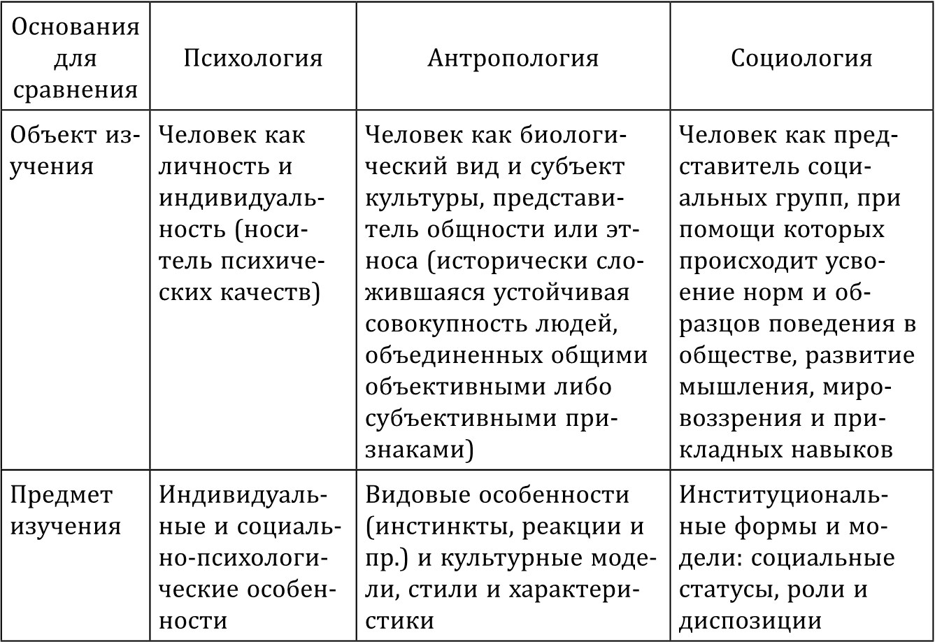 Проблемы человека и личности занимают ведущее место в системе современного научного знания. Для наглядности данного тезиса приведем модифицированную аналитическую таблицу, предложенную Дмитрием Вадимовичем Ольшанским, отражающую специфику изучения человека в психологии, антропологии и социологии [46].