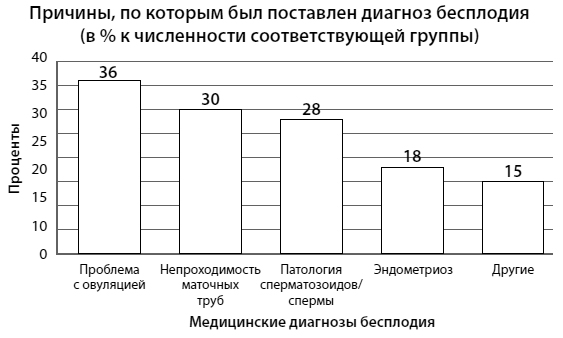 Врачи склонны видеть основными причинами бесплодия нарушения здоровья и считают эту группу самой значительной. Перинатальные психологи обоснованно полагают, что первичны причины первой группы и все расстройства здоровья носят психосоматический характер. В одном из исследований, посвященном причинам бесплодия, ученые пришли к выводу, что чаще всего психогенные факторы первичны. И в то же самое время они могут возникать как вторичные в процессе лечения бесплодия. (7.2) В свою очередь, доля идиопатического бесплодия в разных исследованиях оценивается как 10–30 % от всех случаев. (7.1, 7.3) Я чаще всего имею дело со смешанной формой бесплодия.
