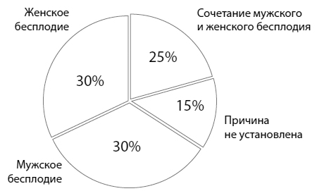 По разным данным, мужская инфертильность составляет от 21 до 48 % от всех случаев бесплодия. Но если исходить из здравого смысла и практического опыта, то это добрая половина всех случаев. Структура бесплодных браков в зависимости от пола, согласно данным статистических исследований, приведена на рисунке 1.2. Это усредненные цифры на основании крупных эпидемиологических исследований, проведенных в Западной Европе, Таиланде и Индии. Так, западноевропейские исследования показали, что мужской фактор составляет 20–24 % от всех случаев. В Таиланде из 1072 супружеских пар с бесплодием в 55,6 % возможные причины бесплодия были выявлены у обоих супругов, в 19,4 % установлен изолированный мужской фактор. Важно отметить, что мужчины проходят обследования гораздо менее охотно, чем женщины. О мужском факторе в бесплодии подробнее в главе 13.