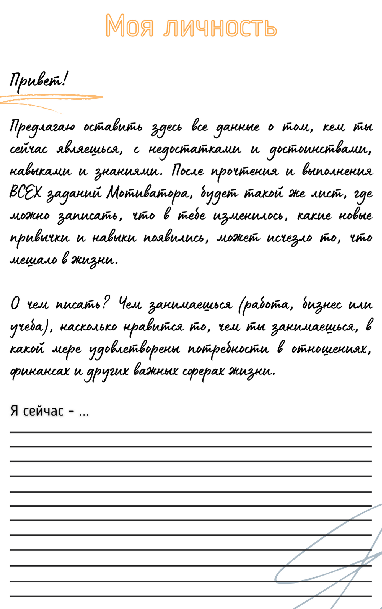 Пора приступать к знакомству с Мотиватором и выполнению заданий, если решишь не выполнять задания – нужного эффекта не получишь. Теория полезна, когда применяется на практике. Ты уже сделал шаг – купил Мотиватор! Ты Молодец! Приятного изучения, и ждем тебя в чате!