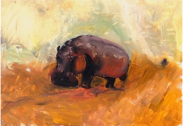 Гиппопотам – «речная лошадь»?!Что ж, вполне возможно!Лишь под водой я грациозноСкачу по дну, едва касаясь ила,Хоть вешу я уж точно больше тонны.А то и три, а то и все четыре.После слона на пьедестале по массе и размерам я.Соперничать могу и с носорогом.Мои клыки его рогов не хуже.И пасть свою разверзнуть я могу,Что львы и крокодилы струсят.Охоты нет мне выбираться из воды.Здесь отдыхаю, сплю, детёнышей рождаю, молоком кормлю.Веду себя как кит, но только пресноводный.Есть у меня и перепонки между пальцев.И плыть могу, и не увязну я в болоте.Мне без воды не жить.Уж если пересохнут мои озёра, реки,Придётся мне искать другой приют.Нырнув, я плотно ноздри, уши прикрываю.Лишь чтоб вздохнуть, к поверхности всплываю.Дышать, смотреть и слышать легко мне из воды,Лишь голову слегка к поверхности подняв,Оставив под водой своё большое тело.Вот вечер, ночь уже подходит.Мне солнце вред уже не сможет причинить.Я на жировку выхожу пастись.Клыками от врагов я защищаюсь,Резцами в солонцах копаюсь.И губы грубые мои мне травку срезать помогают.Кишечник длинный у меня —Легко усвоится трава.Хоть стадом я в воде живу,На трапезу один хожу.Гостей я очень не люблю.Уж кто к воде подходит, сородич мой иль носорог,Напасть могу я на любого.Я территорию свою охотно мечу,Навоз мой хвост разбрызгает умело.Им, как пропеллером, кручу,Помëтом метить территорию хочу.Я по нему дорогу к дому отыщу.Лишь человек с ружьём опасен мне.Мне браконьеры хуже львов, гиен.Я зоопарков частый житель.Чтоб не случилось здесь беды,В вольер ко мне с едой ты рукиУж лучше, братец, не тяни!