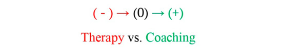 Таким образом, одно из главных различий между психотерапией и коучингом – их отношение к здоровью. Если терапия выводит клиента из нездорового или негативного состояния (-) и переводит его в здоровое или нейтральное состояние (0), то коучинг начинается с этого нейтрального состояния и продвигает клиента к достижению его полного потенциала или позитивному состоянию (+).