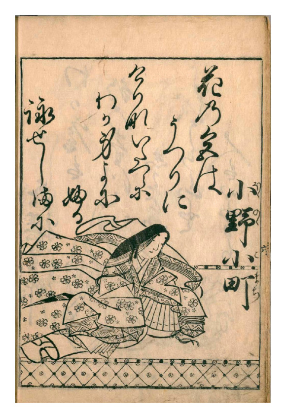 Поблекли цветыПод долгим дождём,Как и моя красотаС годами,Что трачу впустую.Дополнения. Оно Комати ещё при жизни прославилась своей красотой и поэтическим талантом. Ки-но-Цураюки (стих 35) в предисловии к «Кокинсю» писал, что в её стихах много чувства, но мало силы, и сравнивал Оно Комати с прекрасной принцессой, жившей в стародавние времена. Сэй Сёнагон писала о ней в «Записках у изголовья», а многие художники изображали её на гравюрах. В театре Но жизни Оно Комати посвящено несколько пьес. Исследовательница японской литературы Накано Масако выделяет следующие виды рассказов об Оно Комати: рассказы о её красоте, рассказы о сладострастии поэтессы, о высокомерии и плохом обхождении с любовниками, о благой силе её песен, о старении и смерти. Так как достоверных сведений об Оно Комати очень мало, по всей Японии существует много мест, которые предположительно являются могилой поэтессы.