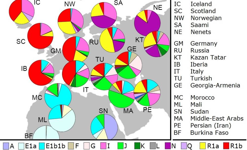 Сотрудники университета штата Иллинойс (School of Chemical Sciencies) [70] провели исследования ДНК коренного населения Европы на период 2005 года. Из карты гаплогрупп Европы следует, что наибольшее число мужчин, живущих на Русской равнине, обладают субкладами Y- хромосомных корневых гаплогрупп R1a, N, I. В меньшей степени мужчинам Русской равнины присущи гаплогруппы R1b, J, E и другие. Гаплогруппа R1a, являясь предковой для большинства славян, наиболее часто встречается в странах восточной Европы. Сразу заметим, что к славянам могут относиться не только носители гаплогруппы R1a, но и других гаплогрупп в соответствии с современным определением термина «славяне». Гаплогруппа N характерна для мужчин угорской части населения России, часть племен которой мигрировала из Сибири в Волго-Уральский регион, оттуда в сторону Финляндии и другие страны Прибалтики. По направлению миграции (в сторону Финляндии) они получили название финно-угры, по аналогии с тем, как племена, достигшие Индии, лингвистами были названы «индоариями», а достигших Ирана – «ираноариями». Гаплогруппа I наиболее часто встречается в странах Балкан, Скандинавии, в местах завоеваний норманнов (викингов) и широко распространилась по Европе. Гаплогруппа R1b характерна для мужчин Западной Европы. Гаплогруппа J и её субклады свойственны мужчинам Ближнего Востока, Кавказа и Северной Африки, откуда носители этой гаплогруппы мигрировали на другие территории.