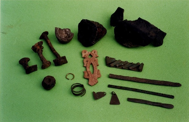 Рисунок 7. Находки Любшанского городища: предметы из металла (в том числе судовые заклёпки), крица (отходы плавки железа)