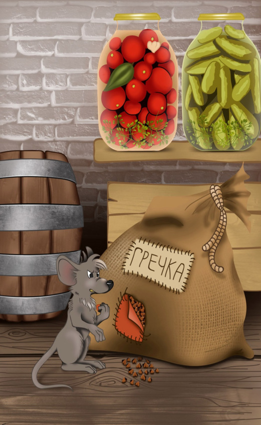 Пуся и Мика поджидали мышку у мешка с крупой. Она появилась ночью и стала воровать крупу бабы Вали.