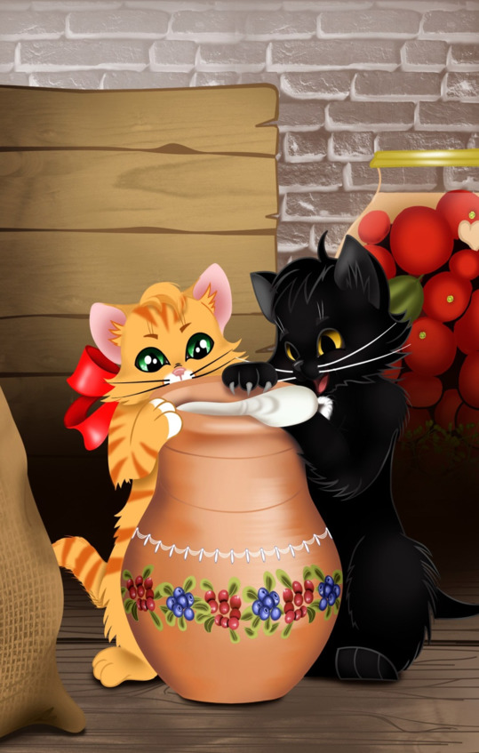 На следующее утро баба Валя несла курам зерно. Проходя мимо погреба, услышала жалобное мяуканье. Открыла дверь. Перед ней виновато стояли два котёнка. Испуганные и перемазанные в сметане.