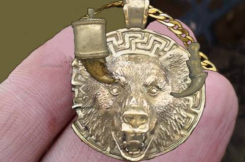 Это была бронзовая цепочка, на которой в центре крепилась бронзовая бляха с изображением оскалившегося медведя, а по краям её были закреплены большие когти медведя.