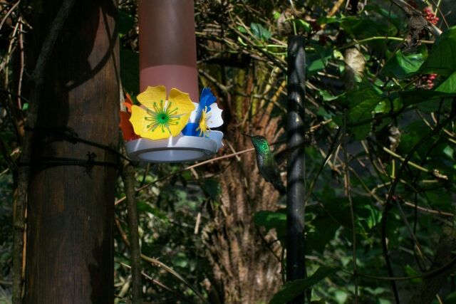 На этой фотографии колибри пьет сладкую воду из поилки.