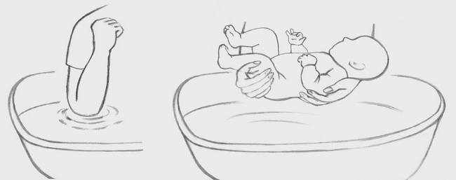 Перед тем как опустить малыша в приготовленную для него ванночку с положенной температурой воды около 37 °C, хорошо еще раз проверить температуру воды локтем. Это поможет некоторым мамам, забывающим иногда измерить температуру воды с помощью термометра, избежать опасности положить ребенка в слишком горячую или слишком холодную воду.