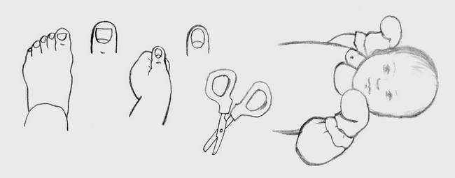 Обрезают ногти на пальцах рук округляя их, а на ногах обрезают под прямым углом. Лучше всего обрезать ногти после ванны. Голову малыша при этом поворачивают так, чтобы кусочки ногтей не попали в рот, глаза или нос.