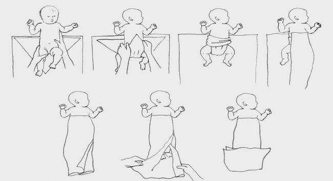 Новорожденного пеленают в течение первых недель жизни в несколько пеленок во избежание охлаждения. Позже наружные пеленки не применяют, а внутренние пеленки завязывают в виде штанишек. Рекомендуют использовать спальные мешки, которые не стесняют свободы движений малыша.