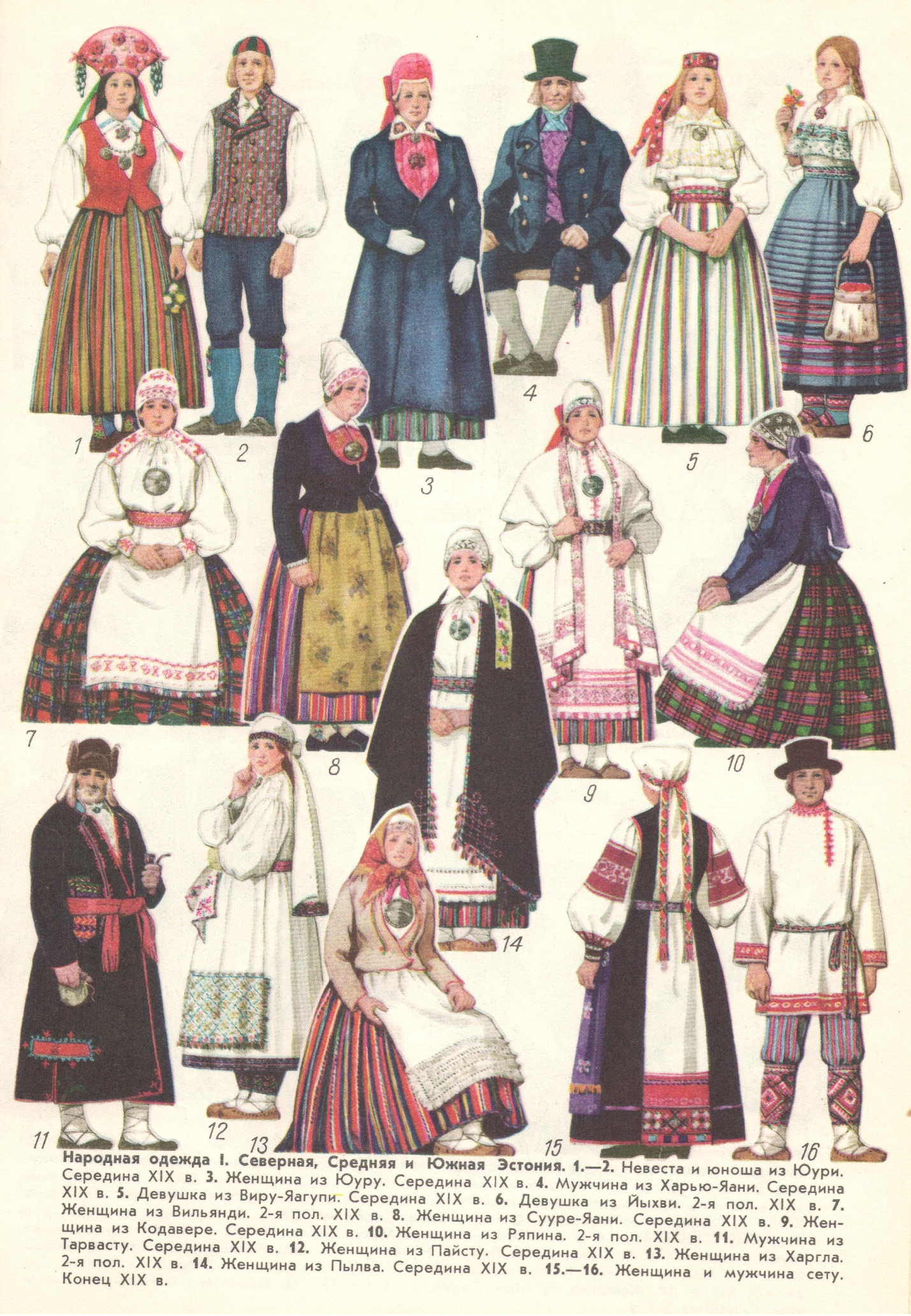 Эсты разных регионов страны в традиционных костюмах. Энциклопедический справочник Советская Эстония, Таллин, 1979 г.